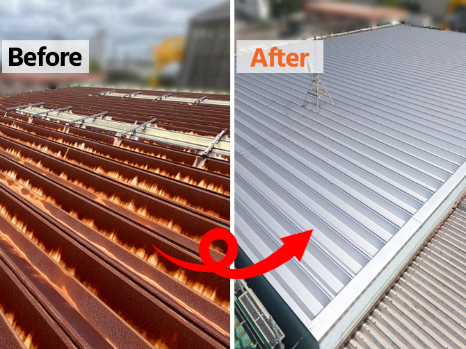 【市原市】塩害で真っ赤に錆びた工場折半屋根を葺き替え|特注サイズ屋根材を大型クレーンで荷揚げ施工