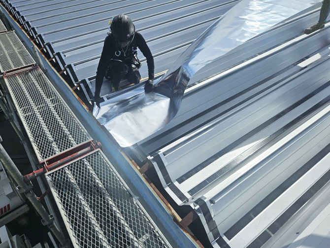 この遮熱材を屋根表面に直接施工する【スカイ工法】では、屋根全体を覆う形で輻射熱の侵入を防ぎます。